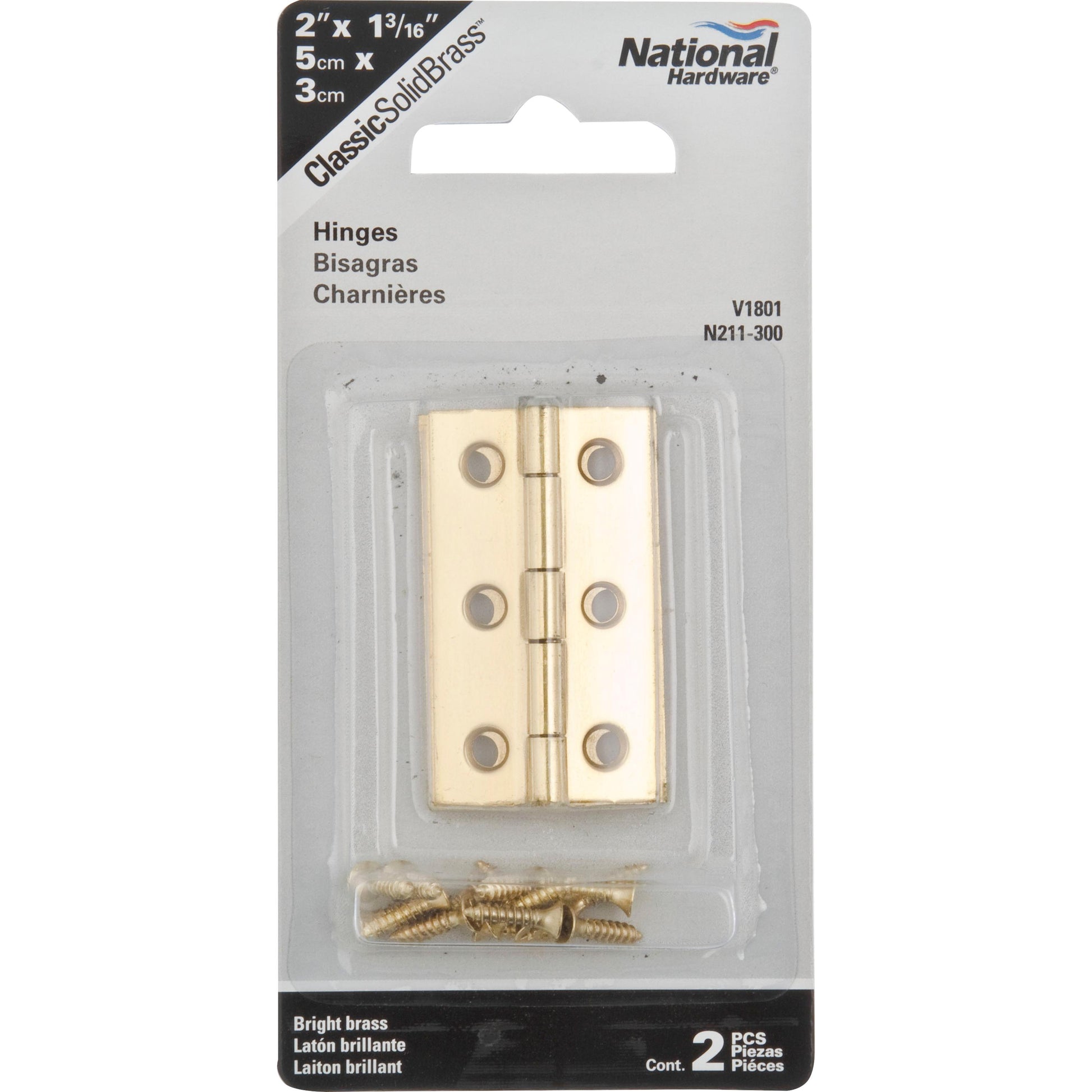 National Hardware's 2" x 1-3/16" Hinges are manufactured of solid brass, with a clear lacquer protective coating.