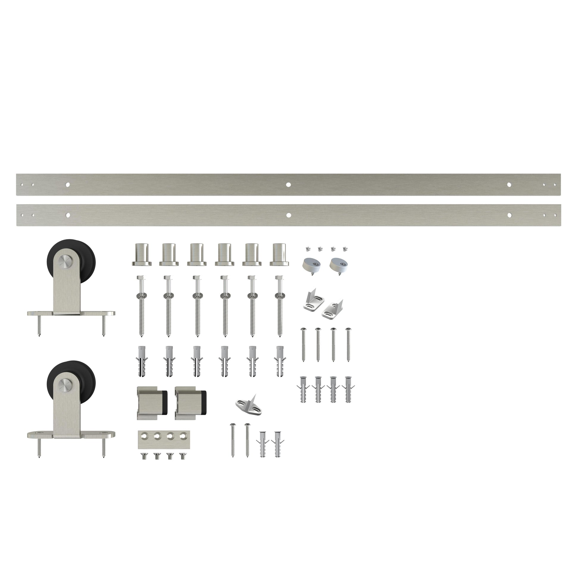 - Includes a two-piece track, two decorative hangers, a connector plate, two end stops, floor guides, spacers, anti-jump discs, mounting hardware, and installation instructions.