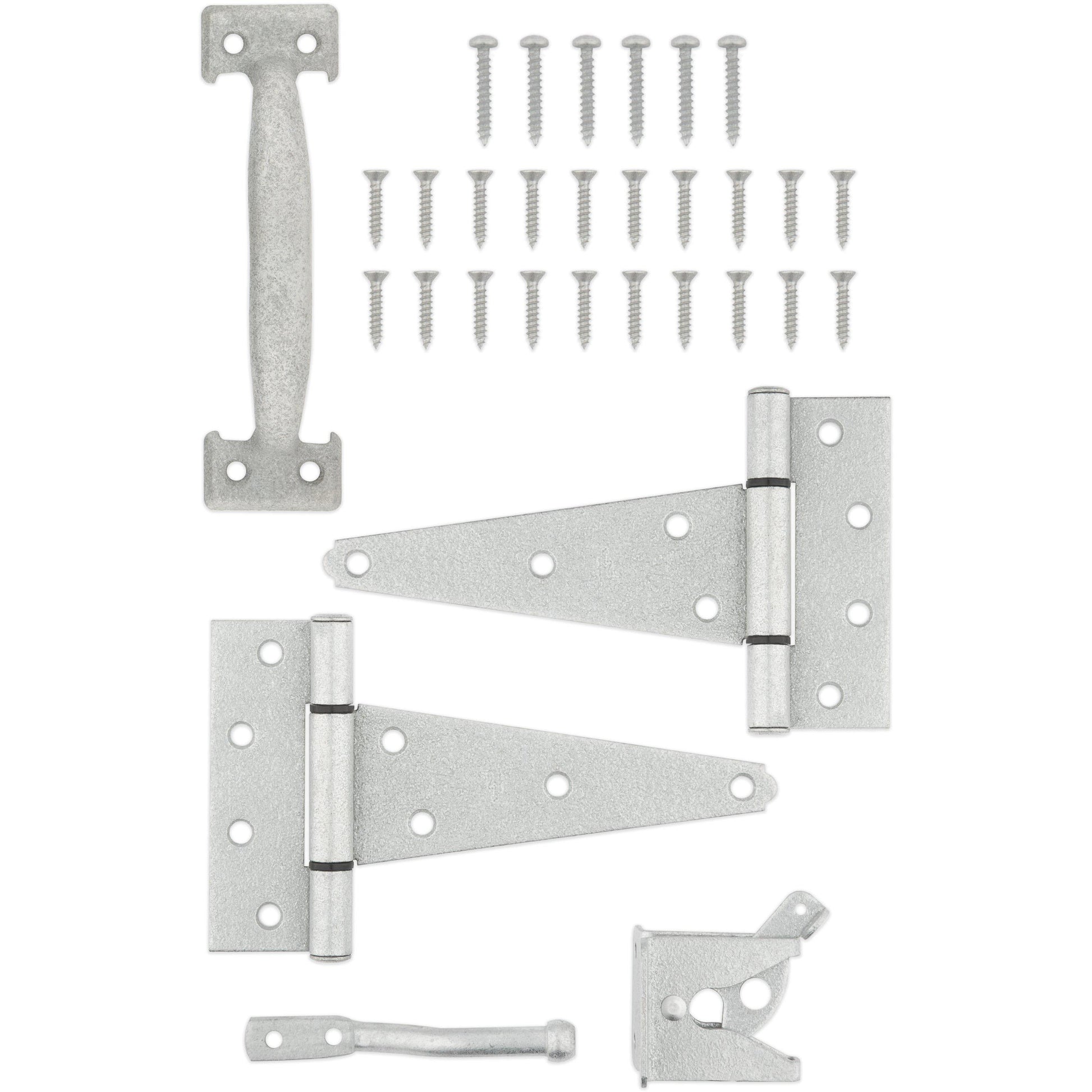 - Kit Includes (1) Gate Latch, (2) T-Hinges, (1) Pull, and associated mounting hardware